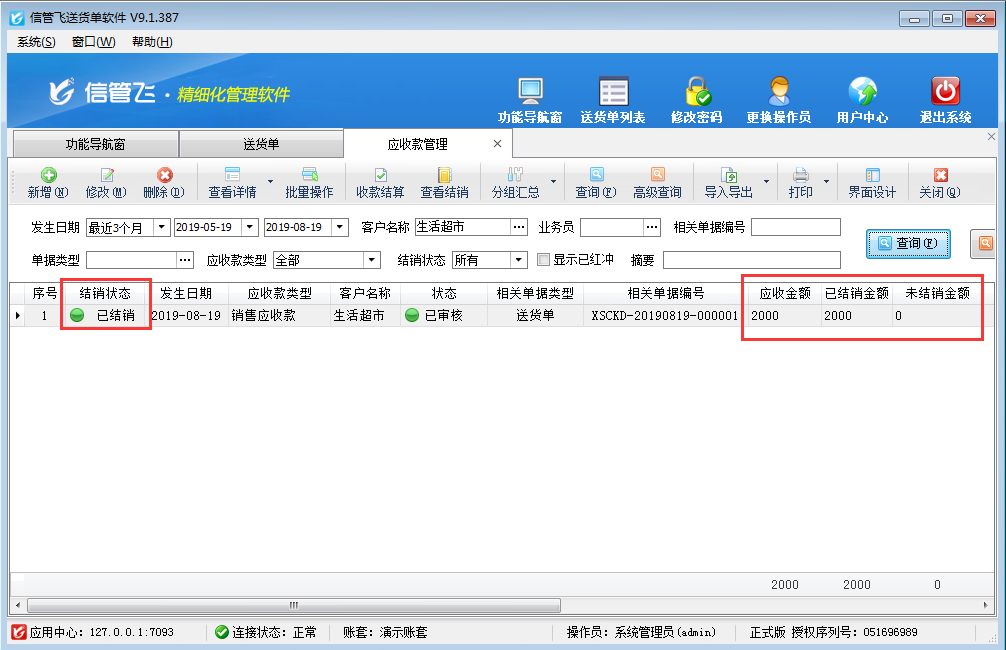收款結算單用來登記收款信息(收款對象即客戶、收款賬戶、收款金額、經手人等),并結銷應收款記錄。本篇文章以送貨單打印軟件為例演示一下對應收款進行收款結算的操作步驟。    在功能導航窗點擊“往來管理”—》“應收款管理”可以打開應收款管理界面,應收款管理是對包括銷售應收款、期初應收款、其他應收款等各類應收款項的集中管理。應收款記錄一般由送貨單自動生成,其類型為“銷售應收款”,或者由退貨單自動生成,其類型為“銷售退貨應退款”。在應收款管理中可以查看應收款記錄對應的業務單據以及應收款詳細結銷情況。如下圖所示,客戶“生活超市”應收金額為