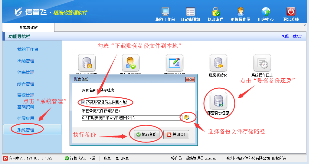 信管飛出納記賬軟件、信管飛送貨單軟件、信管飛RMS等軟件賬套數據默認存儲在軟件安裝目錄下,支持對賬套數據進行備份,如需要更換主機電腦,需要在原來的主機電腦上備份賬套數據,將生成的備份文件復制到新的主機電腦上,然后在新的主機電腦上安裝軟件,使用備份文件還原數據即可。    以信管飛出納記賬軟件為例,演示一下更換電腦時如何在原來的主機電腦上備份賬套數據?    一、在信管飛出納記賬軟件應用中心程序中執行賬套備份。    請在應用中心程序中,點擊“賬套管理”進入賬套管理界面