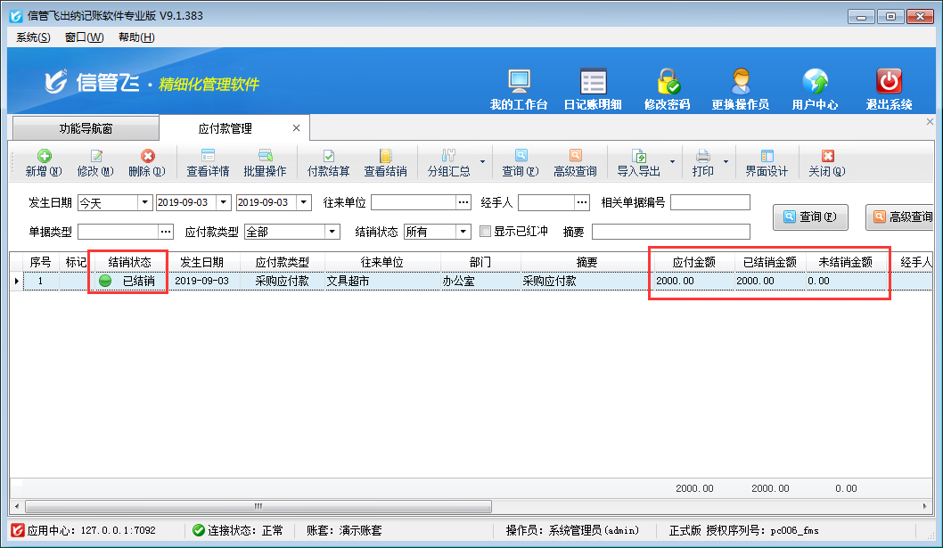 付款結算單可登記付款信息(付款對象即供應商、付款賬戶、付款金額、經手人等),并結銷應付款記錄。本篇文章以出納記賬軟件為例演示一下對應付款進行付款結算的操作步驟。    在功能導航窗點擊“往來管理”—》“應付款管理”打開應付款管理界面新增一條應付款記錄,如下圖所示,供應商“文具超市”應付金額為2000元,已結銷金額為0。    在應付款管理界面點擊“付款結算”按鈕可以打開付款結算單對應付款進行付款結算,如下圖所示,在付款結算單單據主體選擇付款賬戶后錄入“付款金額”2000元,單據明細中“本次結銷金額