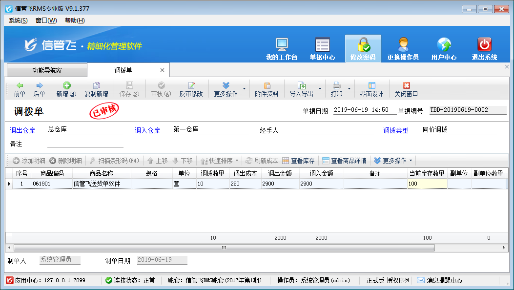 信管飛RMS及信管飛倉庫管理軟件都支持調(diào)撥單,調(diào)撥單主要用于庫存商品在各倉庫之間的調(diào)貨。調(diào)撥分為同價(jià)調(diào)撥和變價(jià)調(diào)撥兩種,其中同價(jià)調(diào)撥方式,商品的成本價(jià)以調(diào)出倉庫的成本價(jià)為準(zhǔn);變價(jià)調(diào)撥(或稱“異價(jià)調(diào)撥”),商品的成本價(jià)可進(jìn)行修改,一般用于分?jǐn)傔\(yùn)費(fèi)/裝卸費(fèi)等運(yùn)輸費(fèi)用。總部到門店的調(diào)撥一般采用變價(jià)調(diào)撥。 在功能導(dǎo)航窗點(diǎn)“倉庫管理”—》“調(diào)撥單”,即可進(jìn)入商品調(diào)撥單操作界面,如下圖所示: 同價(jià)調(diào)撥:同價(jià)調(diào)撥單即商品移庫,是將商品從一個(gè)倉庫轉(zhuǎn)移到另一個(gè)倉庫的過程。同價(jià)調(diào)撥單不產(chǎn)生調(diào)撥費(fèi)用,或調(diào)撥