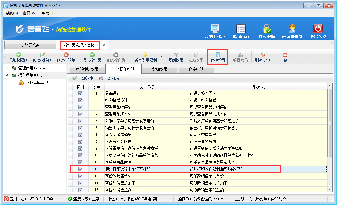 亞拓軟件自主研發的信管飛RMS、信管飛送貨單軟件、信管飛票據打印軟件、信管飛倉庫管理軟件都支持自定義設計打印模板,打印模板設計完成后,為了避免操作員修改錯打印模板,軟件可以設置操作員的打印模板設計權限。(系統管理員默認具有所有權限,不允許修改)。    以信管飛倉庫管理軟件為例,介紹一下如何控制操作員的打印模板設計權限。在功能導航窗,選擇“系統管理”—》“操作員及授權”,選擇操作員“張三”,然后在“其他操作權限”中把“打印格式設計”權限前的勾選符號取消,然后點擊“保存設置”,如下圖1所示:圖1