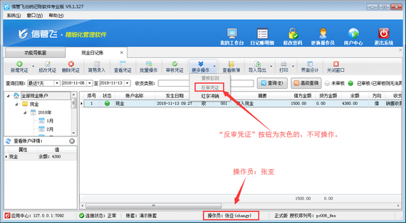 演示視頻觀看鏈接:出納記賬軟件如何設置操作員不可反審憑證演示視頻    信管飛出納記賬軟件中支持反審憑證,憑證已審核后如發現填寫錯誤,可以反審憑證,反審后,憑證狀態恢復為未審核狀態,可以繼續對這個憑證進行修改操作,如下圖所示。    如果需要操作員不可反審日記賬憑證,軟件也支持設置操作員不可反審日記賬憑證權限,下面以信管飛出納記賬軟件專業版為例來演示一下設置操作員不可反審日記賬憑證權限操作步驟。    登錄軟件,在功能導航窗點擊“系統管理”—》“操作員及授權”,進入“