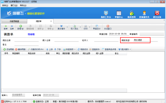 調撥單主要用于庫存商品在各倉庫之間的調貨。調撥分為同價調撥和變價調撥兩種,其中同價調撥方式,商品的成本價以調出倉庫的成本價為準;變價調撥(或稱“異價調撥”),商品的成本價可進行修改,一般用于分攤運費/裝卸費等運輸費用?偛康介T店的調撥一般采用變價調撥。 對于存在多個倉庫的企業來說,對不同倉庫的商品直接進行調撥,是一種很常見的業務。信管飛RMS(進銷存軟件)和信管飛倉庫管理軟件都支持分倉庫管理商品,其中信管飛RMS標準版和專業版、信管飛倉庫管理軟件都支持倉庫調撥功能,可以方便的進行倉庫之間的貨品轉移。