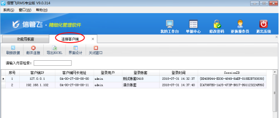 亞拓軟件自主研發的信管飛RMS(進銷存軟件)、信管飛倉庫管理軟件、信管飛送貨單軟件、信管飛出納記賬軟件等軟件都支持多用戶同時登錄使用軟件,數據同步共享。    本文我們以信管飛RMS為例,介紹一下如何查看已登錄軟件的連接客戶端。    第一種方法:打開應用中心程序后,在電腦右下角雙擊打開紅色圖標,系統打開應用中心界面,如圖1所示,點擊“連接客戶端”,可以管理已連接到主機的客戶端電腦信息,包括客戶端IP、客戶端網卡地址、登錄操作員、登錄賬套以及登錄時間。圖1    點“