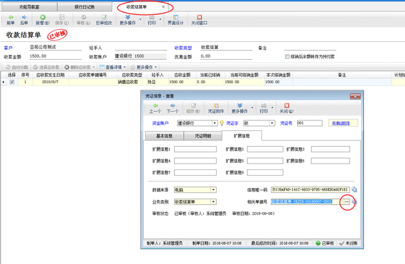 信管飛出納記賬軟件在收/付款結算時支持轉記出納憑證,那么收/付款結算單在轉記出納日記賬憑證之后,如何根據日記賬憑證快速找到相關的收/付款結算單呢?下面演示一下如何根據日記賬憑證快速找到相關的收/付款結算單。    在功能導航窗點擊“出納管理”—》“銀行日記賬”打開銀行日記賬界面,選擇一個日記賬記錄,然后在工具欄點擊“查看憑證”按鈕打開憑證信息查看窗口,在“擴展信息”標簽頁可以查看到日記賬憑證相關的單據(圖一),點擊相關單據號后面的“...”按鈕可以直接打開相應的結算單(圖二)。圖一圖二    相關