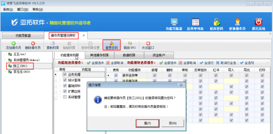亞拓管理軟件、信管飛倉庫管理軟件、信管飛送貨單軟件、信管飛出納記賬軟件、信管飛票據打印軟件等都支持多個操作員登錄使用軟件,如果使用軟件過程中把操作員登錄密碼忘了該怎么辦?下面我們以信管飛送貨單軟件為例詳細介紹一下如何重置操作員登陸密碼。 重置操作員密碼需要系統管理員登錄軟件,如圖1所示。圖1 系統管理員登錄軟件后,在功能導航窗點“系統管理”——》“操作員及授權”即可進入“操作員管理及授權”界面,如圖2所示。圖2 我們以操作員“張三”為例,重置操作員“