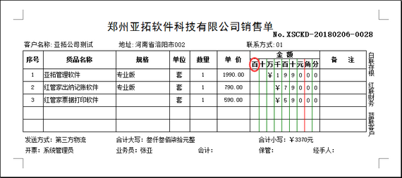 信管飛送貨單軟件、信管飛倉庫管理軟件及亞拓管理軟件等都支持開單打印單據,軟件內置了十幾種打印格式模版,同時支持自定義打印格式模版,本篇文章我們以亞拓管理軟件為例詳細介紹一下打印模版中如何設置財務單元格顯示位數? 演示視頻觀看鏈接:打印模版中如何設置財務單元格顯示位數演示視頻 以軟件內置模版B03為例(圖一),此模版設置金額的最高位為十萬位,那么部分用戶需要顯示百萬或者千萬如何設置呢?下面我們介紹一下操作過程。圖一 打印模版(B03)預覽效果圖 打開一