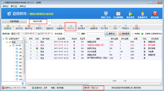紅管家出納記賬軟件、亞拓管理軟件(標準版、專業版)有出納模塊,可以管理現金日記賬和銀行日記賬。鑒于許多用戶在出納管理有審核出納憑證人員,出納現金日記賬和銀行日記賬支持控制操作員的日記賬憑證的審核權限。 以紅管家出納記賬軟件專業版本為例,示范下如何取消操作員“張亞”的現金日記賬、銀行日記賬的可審核權限。在功能導航窗選擇“系統管理”—》“操作員及授權”—》選擇操作員“張亞”,在功能模塊權限中選擇“出納管理”,右側權限設置把現金日記賬和銀行日記賬的可審核權限的勾選符號取消,然候點擊“保存權限設置”按鈕進