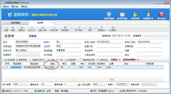 亞拓管理軟件、紅管家送貨單軟件、倉庫管理軟件都支持在“基礎資料”—》“商品信息”中維護商品的規格信息,軟件默認允許開單可以直接在單據明細中修改商品規格,為了避免開單修改商品規格,軟件可以設置開單時單據明細中的商品規格不允許修改,我們以送貨單軟件為例示范下如何設置?     首先我們在“基礎資料”—》“商品信息”中添加一個帶有規格的商品信息,如圖1所示,商品“EPSON針式打印機”的商品規格為“LQ-1800K”。圖1     在功能導航窗選擇“系統管理”—》“系統參