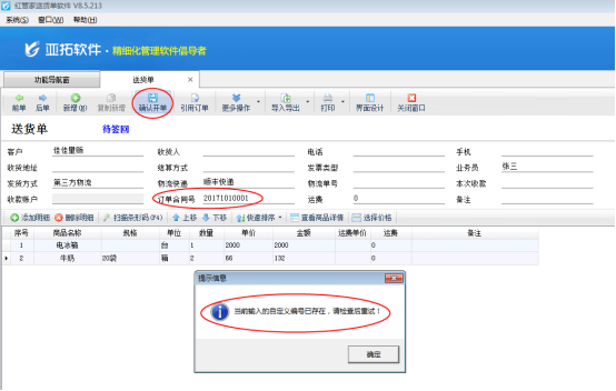亞拓軟件自主研發(fā)的亞拓管理軟件、紅管家送貨單軟件、紅管家倉(cāng)庫(kù)管理軟件等都支持開(kāi)單后自動(dòng)生成單據(jù)編號(hào),另外,軟件也支持錄入自定義編號(hào)(不是單據(jù)編號(hào)),用戶(hù)可以在自定義編號(hào)內(nèi)錄入訂單合同號(hào)等信息,為了避免錄入的自定義編號(hào)出現(xiàn)重復(fù),軟件支持參數(shù)設(shè)置自定義編號(hào)不可重復(fù)。 以紅管家送貨單軟件為例,在“系統(tǒng)管理”—》“系統(tǒng)參數(shù)配置”—》“業(yè)務(wù)參數(shù)”內(nèi)將“數(shù)據(jù)可否重復(fù)參數(shù)”中的“自定義單據(jù)編號(hào)可重復(fù)”參數(shù)的勾選取消,然后保存設(shè)置。如下圖1所示:圖1 設(shè)置完成后,打開(kāi)功能導(dǎo)航窗的“業(yè)務(wù)處理”—》“新開(kāi)