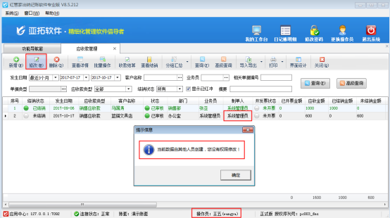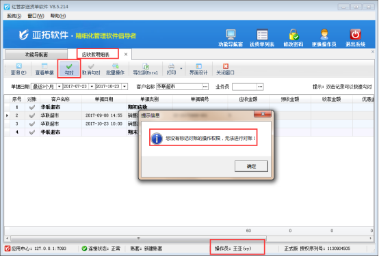 亞拓管理軟件、紅管家送貨單軟件支持管理應(yīng)收賬,對(duì)于已結(jié)銷(xiāo)的應(yīng)收款,可以在應(yīng)收款明細(xì)表中標(biāo)記對(duì)賬。軟件支持設(shè)置操作員是否具有對(duì)賬權(quán)限,以送貨單軟件為例,示范下如何控制操作員的應(yīng)收款對(duì)賬權(quán)限。 在功能導(dǎo)航窗,點(diǎn)擊“操作員管理及授權(quán)”,進(jìn)入操作員管理及授權(quán)頁(yè)面,選擇需要設(shè)置的操作員“王亞”(系統(tǒng)管理員默認(rèn)具有所有權(quán)限,不允許修改),打開(kāi)“其他操作權(quán)限”,在最后一個(gè)權(quán)限“應(yīng)收應(yīng)付款對(duì)賬”勾選符號(hào)取消,然后保存操作員權(quán)限。如下圖1所示:圖1 保存權(quán)限后,使用操