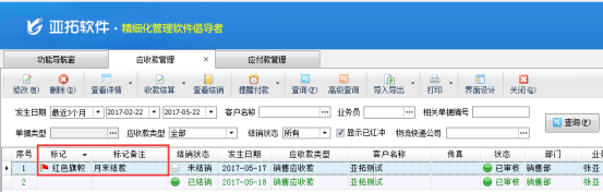 亞拓管理軟件和紅管家倉(cāng)庫(kù)管理軟件都可以對(duì)應(yīng)收款管理、應(yīng)付款管理進(jìn)行標(biāo)記備注。送貨單軟件的應(yīng)收款管理中也可以對(duì)應(yīng)收款進(jìn)行標(biāo)記備注。下面我們以亞拓管理軟件專(zhuān)業(yè)版為例,介紹對(duì)應(yīng)收款管理標(biāo)記備注的操作步驟(應(yīng)付款和應(yīng)收款操作一致)。     在功能導(dǎo)航窗點(diǎn)“往來(lái)管理”—》“應(yīng)收款管理”即可進(jìn)入“應(yīng)收款管理”界面,在應(yīng)收款界面,選中一條單據(jù)記錄后,雙擊“標(biāo)記”系統(tǒng)彈出“標(biāo)記備注”窗口,如圖1所示。 圖1     在“標(biāo)記備注”窗口選擇標(biāo)記旗幟,錄入標(biāo)記內(nèi)容,然后點(diǎn)擊