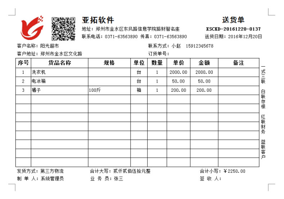 紅管家送貨單打印軟件是一款針對中小型企業開發的集送貨管理(發貨管理)、退貨管理(銷售退貨)、銷售收款(應收款管理)等功能為一體的送貨管理及打印軟件。 紅管家送貨單軟件內置有模板設計器,軟件中提供數十種送貨單格式(發貨單格式),為了滿足更多客戶的需求,除了可以打印單據基本數據外,模板設計器增加了“二維碼”組件,可以實現“二維碼”打印,將單據相關信息生成二維碼圖片,客戶可利用手機等通訊設備掃描送貨單的二維碼,了解單據的更多相關信息。添加了二維碼信息的送貨單樣式如圖1所示:圖1 送貨單樣式