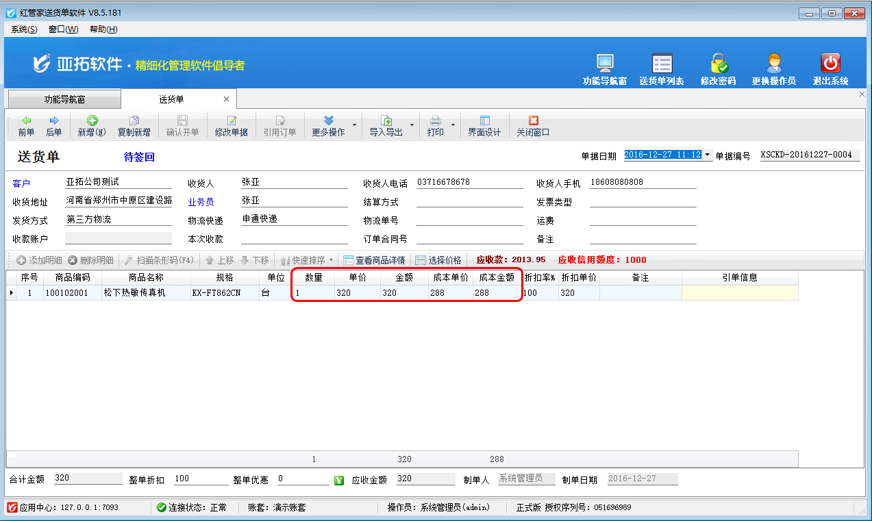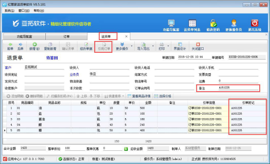 紅管家送貨單軟件、亞拓管理軟件都支持先開訂單,然后送貨單和采購銷售出庫單可以引用訂單的內容。有時候需要引用訂單的附記內容,可以在送貨單等單據引用訂單的時候可在送貨單界面的單據明細顯示引單附記內容。 以送貨單軟件為例,如何引用訂單顯示引單附記?軟件默認引單附記調用的是訂單的備注內容。先開一個訂單,訂單的備注內容為“A161226”,保存并審核訂單,訂單內容如下圖所示: 新開送貨單,通過界面設計把單據明細中的“引單附記”顯示出來,選擇“引用訂單”,引用之