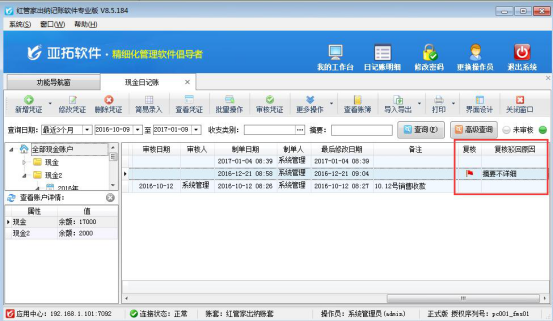 紅管家出納記賬軟件標準版、專業版中可對已開出的憑證進行復核駁回操作,對于有問題的憑證可標記駁回原因,可對原因進行分類以不同的顏色標記。 以出納記賬軟件專業版的現金日記賬為例,如何標記駁回原因。打開左側導航窗的“出納管理”,選擇“現金日記賬”中一個憑證(只有待審核的憑證才能被標記),點擊工具欄中的“更多操作”下的符合駁回,可對有問題的憑證標記顏色和駁回原因,如下圖所示: 點擊“駁回”則標記成功,在現金日記賬界面該憑證會顯示駁回標記和駁回原因,如下圖所示