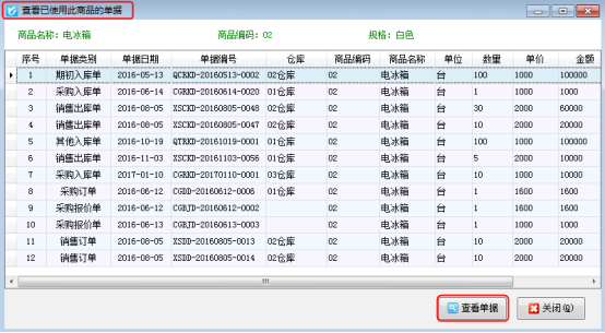 亞拓管理軟件、紅管家送貨單軟件、紅管家倉庫管理軟件都包括對商品信息的管理,軟件都支持對商品進行查看已使用此商品的單據,方便用戶查看使用過該商品的全部的單據信息。本文以亞拓管理軟件為例詳細介紹一下軟件中“查看已使用此商品的單據”功能的使用方法。 在功能導航窗點擊“基礎資料”—》“商品信息”打開商品信息界面,如圖1所示。圖1 商品信息界面 我們以商品“電冰箱”為例,選中商品后,在工具欄點擊“更多操作”—》“查看已使用此商品的單據”可以打開“查看已使用此商品的單據”窗口,如圖2所示,可以看到