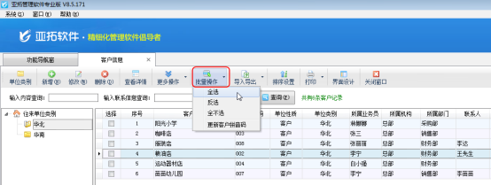 亞拓管理軟件、紅管家倉(cāng)庫(kù)管理軟件、紅管家出納記賬軟件都包括對(duì)客戶(hù)信息和供應(yīng)商信息的管理,紅管家票據(jù)打印軟件和紅管家送貨單軟件也包括對(duì)客戶(hù)信息的管理。客戶(hù)信息集中管理和維護(hù)客戶(hù)資料,供應(yīng)商信息實(shí)現(xiàn)供應(yīng)商資料的維護(hù)。在軟件中如何快速批量修改客戶(hù)或供應(yīng)商單位類(lèi)別呢?下面我們以亞拓管理軟件專(zhuān)業(yè)版為例詳細(xì)介紹下如何批量修改客戶(hù)單位類(lèi)別。另外,批量修改供應(yīng)商單位類(lèi)別的方法基本一樣,在此不再贅述。 在功能導(dǎo)航窗中點(diǎn)擊“基礎(chǔ)資料”—》“客戶(hù)信息”,即可進(jìn)入“客戶(hù)信息”功能,其界面如圖1所示。圖1 以圖
