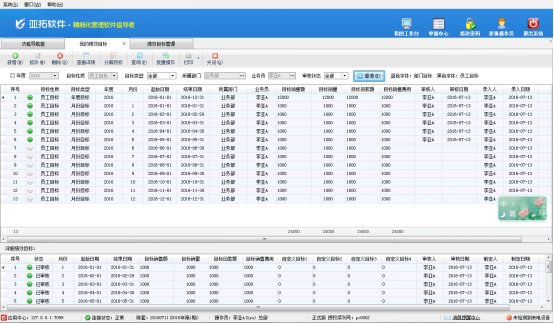 績效目標管理模塊屬于擴展模塊,只有在亞拓管理軟件標準版和專業版中才能使用,績效目標管理可以統一管理部門目標、員工目標等,那么操作員又該如何查看并維護個人績效目標呢?下面我們以亞拓管理軟件專業版為例詳細介紹下進銷存軟件內操作員如何管理個人績效目標?    在功能導航窗點擊“擴展應用”——“我的績效目標”,即可進入“我的績效目標”界面,其界面如下圖所示。    新增:在工具欄點擊“新增”按鈕即可新增“我的績效目標”,可以選擇“目標類型(年度目標、月份目標)”維護目標銷售額、目標銷量、目標回款額、目標銷售