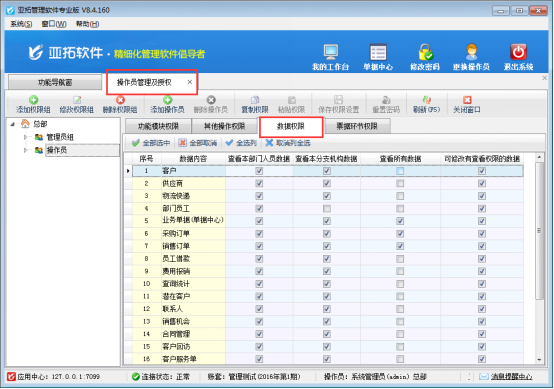 亞拓管理軟件、紅管家出納記賬軟件、紅管家倉庫管理軟件等都可以設置操作員的查看修改業務單據權限。通過設置操作員的“數據權限”,更清晰方便的管理分配的操作員單據權限。通過“系統管理”---》操作員及授權進入操作員管理及授權界面,在權限模塊可看到“數據權限”,在此設置操作員的“可修改有查看權限的數據”的權限,如圖1所示: 圖1    通過系統管理員登錄軟件進行修改操作員權限,只有系統管理員才能修改操作員權限,我們以操作員“李靜”為例介紹下數據權限的設置,通過“采購管理”—》“采購訂單”—》“數據權限”。在數據權限界面,勾選