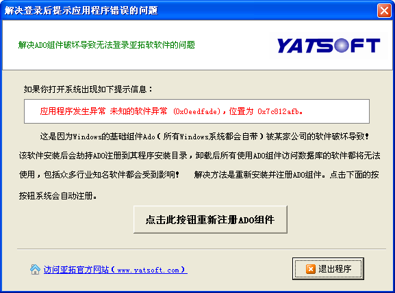 部分用戶機(jī)器在登錄出納記賬系統(tǒng)或商業(yè)進(jìn)銷存系統(tǒng)時(shí),啟動(dòng)界面過后,直接報(bào)錯(cuò)并退出系統(tǒng)。系統(tǒng)提示錯(cuò)誤信息如下: 出現(xiàn)這個(gè)錯(cuò)誤提示,是由于Windows的基礎(chǔ)組件ADO數(shù)據(jù)庫訪問引擎被某家公司的軟件破壞導(dǎo)致。安裝該軟件后,會(huì)自動(dòng)劫持ADO注冊(cè)到其程序所在目錄,卸載該軟件后后所有使用ADO數(shù)據(jù)庫訪問引擎的軟件都將無法使用,包括眾多知名行業(yè)軟件!我們對(duì)相關(guān)問題已經(jīng)進(jìn)行保存和取證,也感謝眾多熱心用戶的及時(shí)反饋! 為此,我們專門開發(fā)了一個(gè)小工具,用于重新注冊(cè)ADO。使用方法如下:(1)下載亞拓軟件ADO注冊(cè)程序