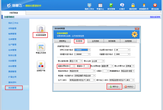 在當今快節奏的商業環境中,企業對于高效、精準的財務管理軟件需求日益增長。信管飛軟件支持開單時靈活選擇發票類型并跳出對應稅率,計算商品的“含稅單價”及“稅額”,讓開單過程更加流暢,計算更加精準! 簡單設置,稅率管理不犯難 在信管飛軟件里,設置默認發票稅率超容易。進入功能導航窗,依次點擊“系統管理”—“系統參數配置”—“系統參數”,就能看到稅率設置界面。在此可分別設置“普通發票稅率”和“增值稅發票稅率”,設置完點“保存”,配置馬上生效,讓稅率管理井井有條