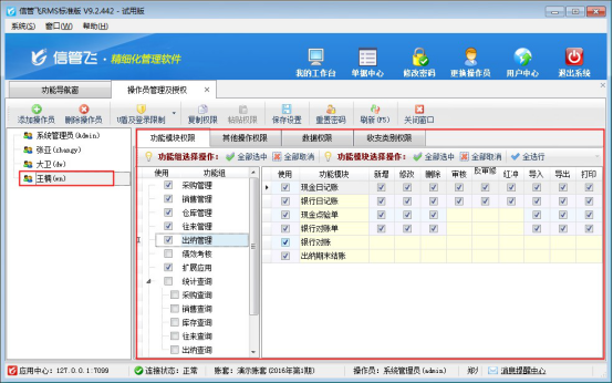 信管飛RMS軟件、信管飛倉庫管理軟件、信管飛出納記賬軟件、信管飛送貨單軟件等都支持設置多個操作員登錄軟件,本文以信管飛RMS軟件標準版為例演示一下如何新增操作員賬號并設置操作員權限? 操作員及授權實現對操作員的管理和權限分配。權限分為功能模塊權限、其他操作權限、數據權限等。另外部分權限(如資金賬戶權限)需要在“系統參數配置”中啟用相應的參數,才可以使用。 在功能導航窗點擊“系統管理”—》“操作員及授權”即可進入到操作員管理及授權界面,如下圖所示:&n