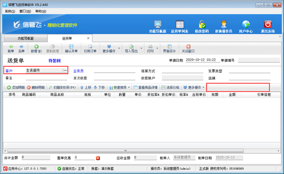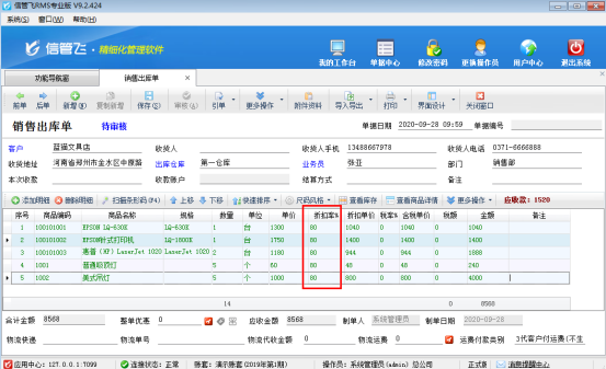 信管飛送貨單軟件、信管飛倉庫管理軟件、信管飛RMS(進銷存軟件)開單時,當商品存在打折情況時,支持錄入商品的折扣率。當商品明細的內容比較多時,為了快速開單,提高效率,可以批量更新單據明細中的折扣率。下面我們以信管飛RMS專業版為例詳細介紹下如何批量修改商品折扣率。 登錄軟件,在功能導航窗點“銷售管理”—》“銷售出庫單”,進入新開銷售單界面,錄入商品信息,默認的折扣率是100%,如圖1所示:圖 1 在單據明細上方,點擊“更多操作”—》“修改商品折扣”,彈出修改商品折扣率的窗口,輸入折扣(