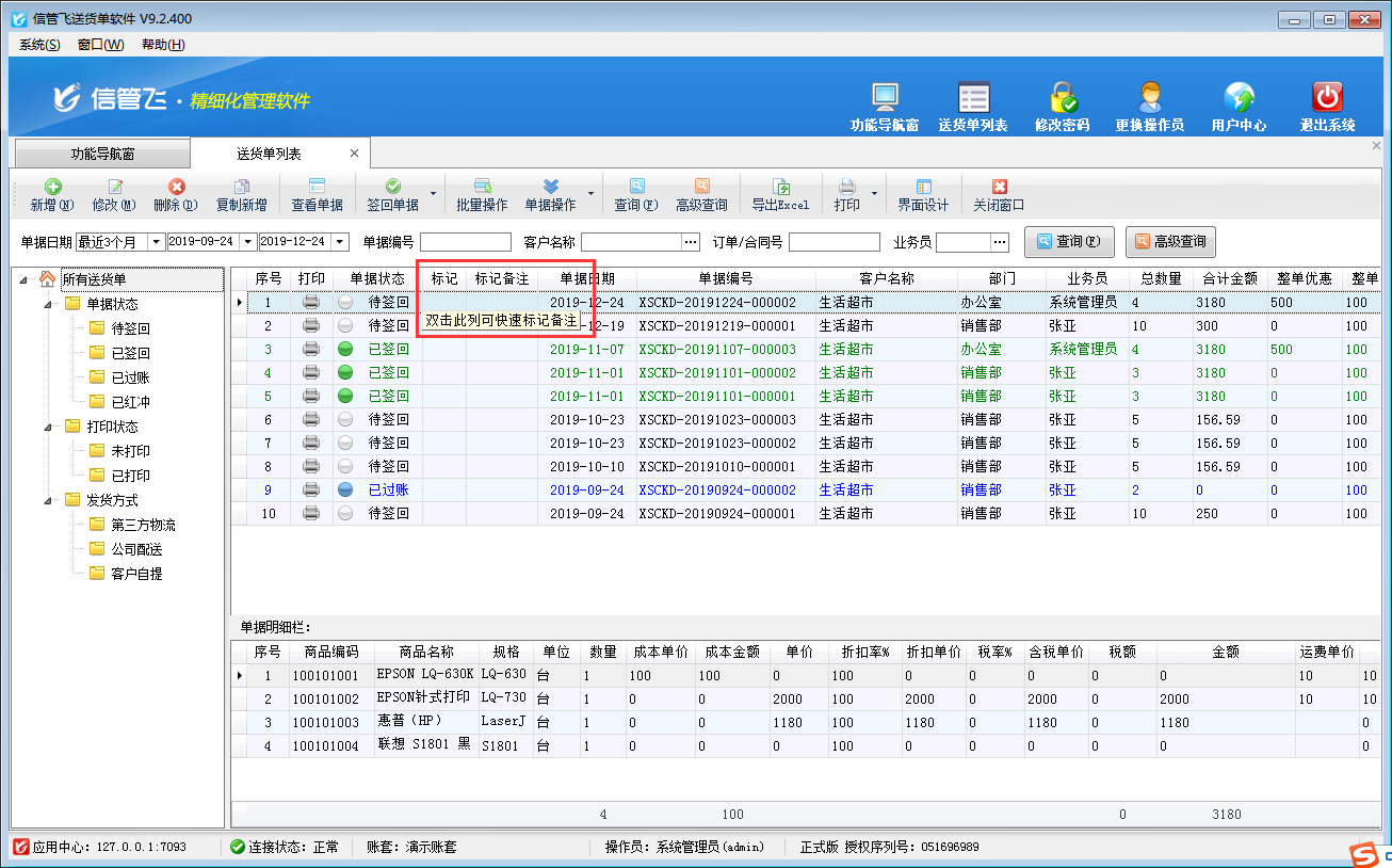 信管飛送貨單軟件支持對訂單列表、送貨單列表以及退貨單列表標記備注。本文介紹一下送貨單軟件中對送貨單列表標記備注的具體操作步驟。 在功能導航窗點“業務處理”—》“送貨單列表”即可進入“送貨單列表”界面,然后在送貨單列表界面,選中一條單據記錄后,點擊“單據操作”—》“標記備注”,系統彈出“標記備注”窗口,如下圖所示。 在“標記備注”窗口選擇標記旗幟,錄入標記內容,然后點擊“標記”按鈕即可標記單據備注。 標記備注后,送貨單列表界面會顯示標記的內容,如下圖所