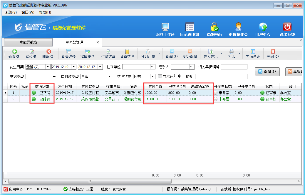 采購預付款是我們提前預付給供應商的金額,可以用來沖銷采購產生的應付款,本文以信管飛出納記賬軟件專業版為例演示一下如何使用采購預付款沖銷采購應付款?    在功能導航窗點擊“往來管理”—》“應付款管理”打開應付款管理界面,如下圖所示,在應付款管理內對同一個供應商分別新增一條應付款記錄,一條預付款記錄,結銷狀態為“未結銷”狀態,已結銷金額為0。    在應付款管理界面工具欄有“付款結算”按鈕,可以打開付款結算單對采購應付款/預付款進行付款結銷。如下圖所示,供應商“文具超市”應付金額1000元,采購預付