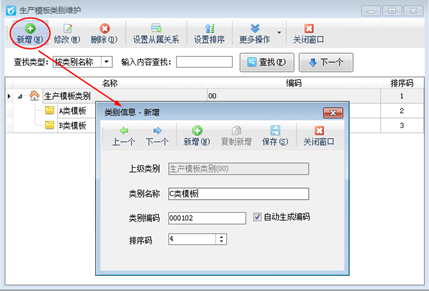 模板類別:可以維護模板類別,后續可以按照模板類別管理生產模板。點工具欄中的“模板類別”按鈕會彈出“生產模板類別維護”的界面,在此界面上點“新增”按鈕可以進增加類別信息的操作,如圖2所示。