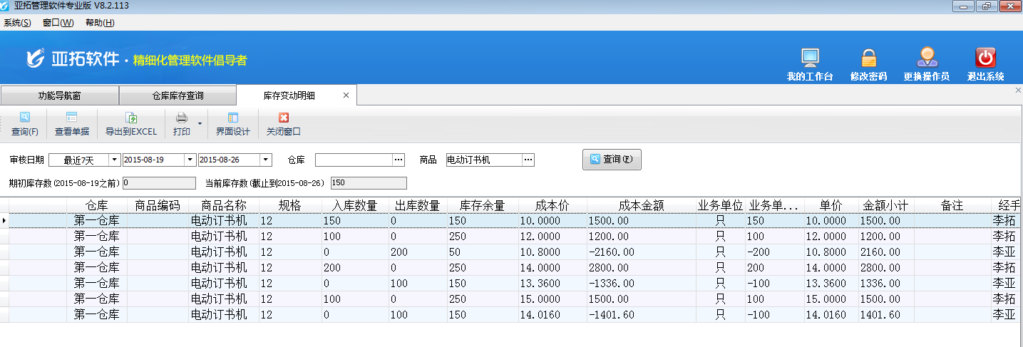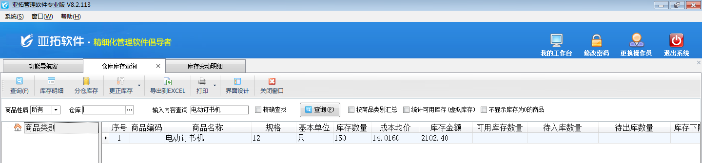所以咱們在倉庫庫存查詢中查出“電動訂書機”庫存數量為150個,庫存單價為14.016,庫存金額為2102.4就是這么得出的咱們最終查詢出的結果。