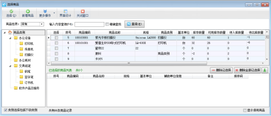 2、在開單據(jù)的時(shí)候可以在商品窗口查看庫存可用數(shù)量(需要先在系統(tǒng)參數(shù)配置—》業(yè)務(wù)參數(shù)中設(shè)置“在選擇商品窗口查看庫存可用數(shù)量”選項(xiàng)),這樣我們在開單的時(shí)候就能清楚的看到商品的實(shí)際庫存數(shù)量和可用庫存數(shù)量,其商品選擇窗口如下圖2所示。