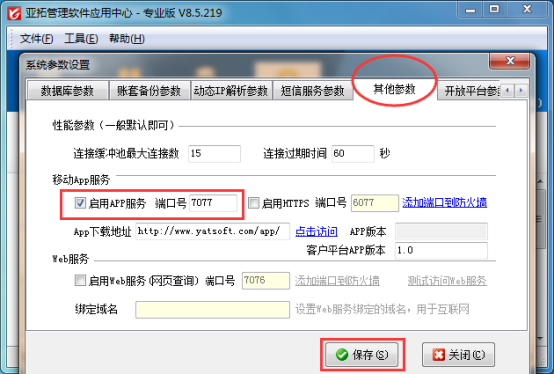 亞拓軟件手機APP是結(jié)合PC電腦端進行使用的,需要局域網(wǎng)下連接PC端應(yīng)用中心的IP地址進行連接PC端的數(shù)據(jù)進行同步數(shù)據(jù),手機APP占用客戶端連接數(shù),相當(dāng)于一個客戶端。以亞拓管理軟件為例示范下如何啟用手機APP 功能,打開電腦端的應(yīng)用中心程序—》系統(tǒng)參數(shù)—》其他參數(shù)中勾選上“啟用APP服務(wù)”,手機端口默認(rèn)是“7077”,然后點擊保存,如下圖1所示: