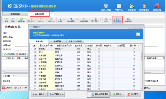 亞拓管理軟件對應(yīng)的手機APP支持開銷售訂單、銷售出庫單、采購訂單、采購入庫單和查看采購單列表、銷售單列表及對基礎(chǔ)資料的維護等功能。手機APP的開單界面內(nèi)容顯示需要在電腦端的界面設(shè)計中進行配置顯示,軟件支持自定義設(shè)置手機APP的界面顯示(單據(jù)主體內(nèi)容、單據(jù)明細(xì)內(nèi)容及計算公式),我們以銷售出庫單為例,示范下在界面設(shè)計中手機APP的銷售出庫單開單界面設(shè)計,如下圖4、圖5所示: