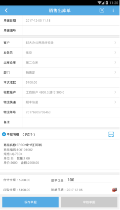 PC端配置完移動APP的界面后打開銷售出庫單界面,界面顯示如下圖6所示(點擊單據(jù)明細(xì)的商品信息可以顯示出商品的詳情信息):