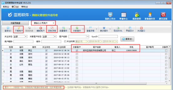 提示測試成功,則可以開業(yè)務(wù)單據(jù)發(fā)送微信消息。發(fā)送微信消息需要下載微信公眾號用戶并關(guān)聯(lián)軟件中客戶信息,在功能導(dǎo)航窗選擇“擴(kuò)展應(yīng)用”—》“微信公眾號用戶”,進(jìn)入微信公眾號用戶管理界面,點擊“下載用戶”可以下載關(guān)注公司微信公眾號的用戶(下載用戶速度有點慢,請耐心等待一下)。下載完成后,工具欄點擊“獲取詳情”可以獲取關(guān)注用戶的信息。對用戶關(guān)聯(lián)下軟件中所對應(yīng)的客戶。如下圖2所示: