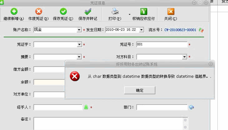 首次下載安裝好好用財(cái)務(wù)出納記賬系統(tǒng),在“現(xiàn)金日記賬”或“銀行日記賬”功能中,點(diǎn)擊“新增憑證”進(jìn)行憑證錄入時(shí),如果出現(xiàn)下圖所示錯(cuò)誤: