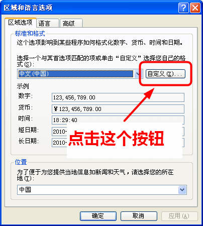 然后打開“自定義區(qū)域選項(xiàng)”窗口,點(diǎn)擊時(shí)間按鈕查看時(shí)間格式。
