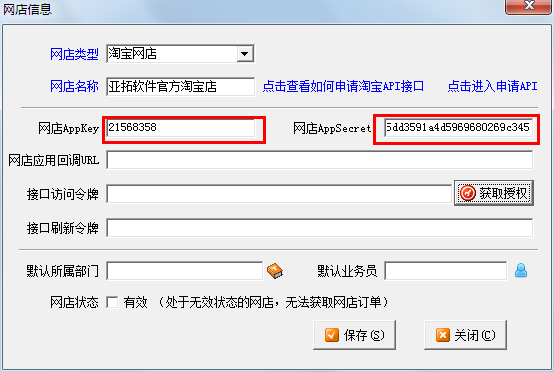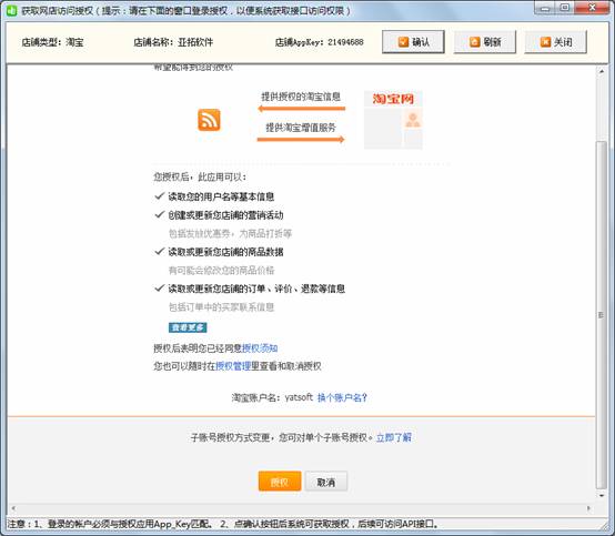 在“網(wǎng)店信息”窗口點(diǎn)擊 “獲取授權(quán)”按鈕進(jìn)行測試,注意由于目前淘寶API的限制,淘寶3鉆以下店鋪申請(qǐng)的API的授權(quán),24小時(shí)就會(huì)過期,屆時(shí)需要重新登錄一下(系統(tǒng)在授權(quán)失效時(shí)會(huì)彈出授權(quán)窗口,登錄一下即可)。