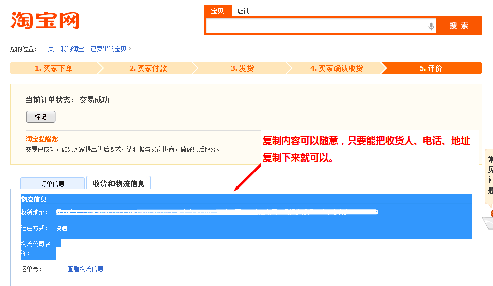 首先,打開(kāi)淘寶訂單詳情頁(yè),然后在“收貨和物流信息”中復(fù)制“圖示部分”的內(nèi)容: