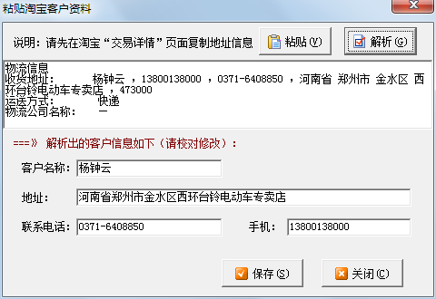 然后,在送貨單或訂單開(kāi)單窗口,點(diǎn)“更多操作”->"粘貼淘寶客戶(hù)資料",在彈出的窗口中是不是客戶(hù)信息已經(jīng)解析出來(lái)了?如果需要復(fù)制其他客戶(hù)資料,重復(fù)上面的步驟,點(diǎn)“粘貼”,然后點(diǎn)“解析”按鈕即可。