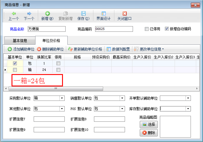 點(diǎn)擊“單位及價格”,進(jìn)入單位及價格界面,添加輔助單位,設(shè)置基本單位與輔助單位之間的換算關(guān)系,如商品“方便面”的基本單位“包”與輔助單位“箱”之間的換算關(guān)系為一箱等于24包,如下圖二所示。
