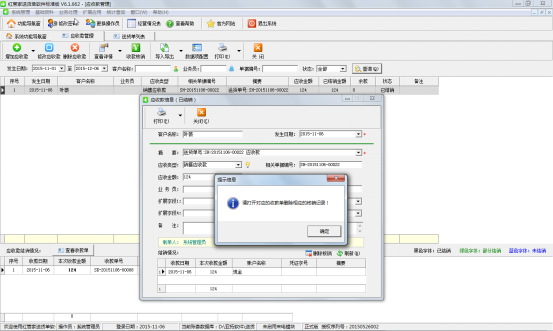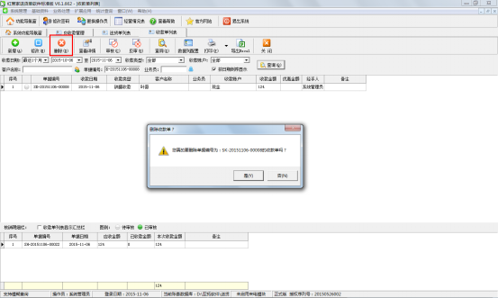 如果相應的收款單已經審核過了,此時刪除時,系統會提示“當前收款單已審核,不允許進行刪除操作!(如確需刪除請先反審)”,如下圖五所示。