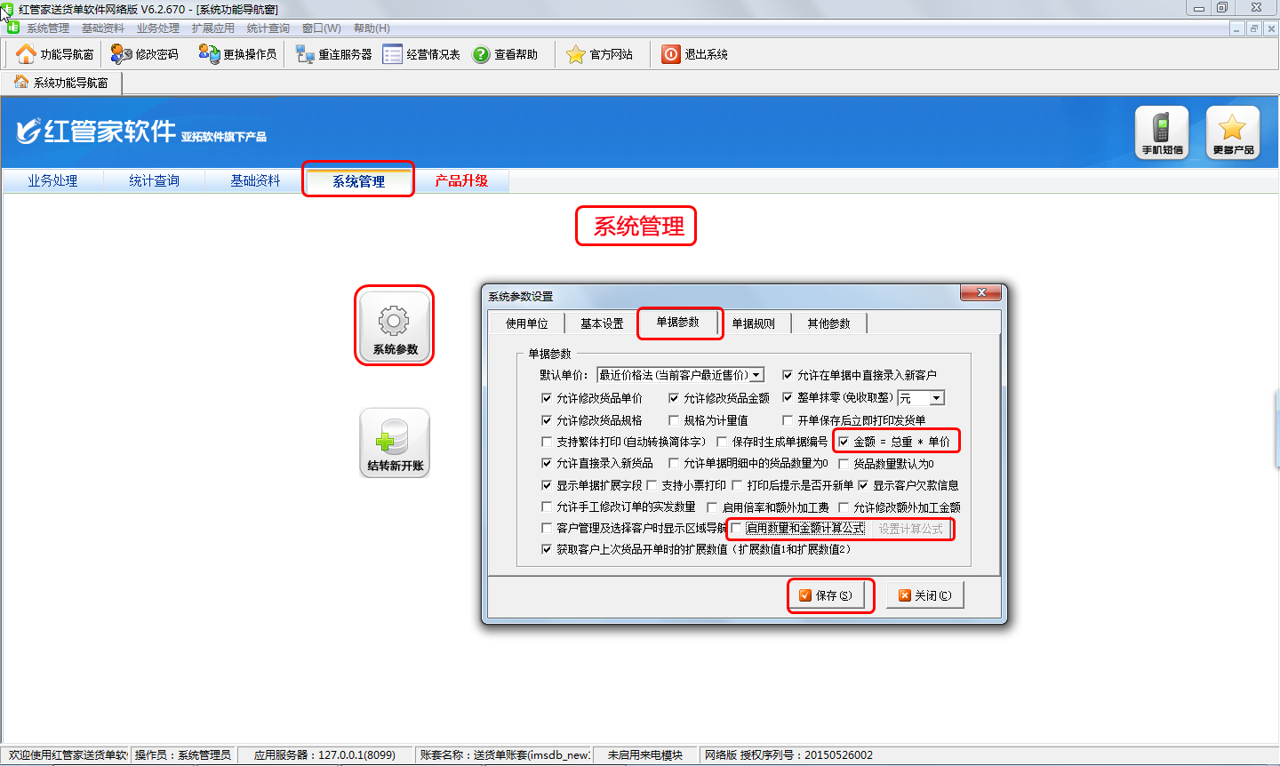 首先打開(kāi)功能導(dǎo)航窗,點(diǎn)擊“系統(tǒng)管理”—》“系統(tǒng)參數(shù)”—》“單據(jù)參數(shù)”,將默認(rèn)復(fù)選的“啟用數(shù)量和金額計(jì)算公式”選項(xiàng)打勾取消,然后打勾選中“金額=總重*單價(jià)”選項(xiàng)啟用按重量計(jì)算金額,配置完之后點(diǎn)擊“保存”按鈕保存剛剛所做的配置,如下圖一所示。