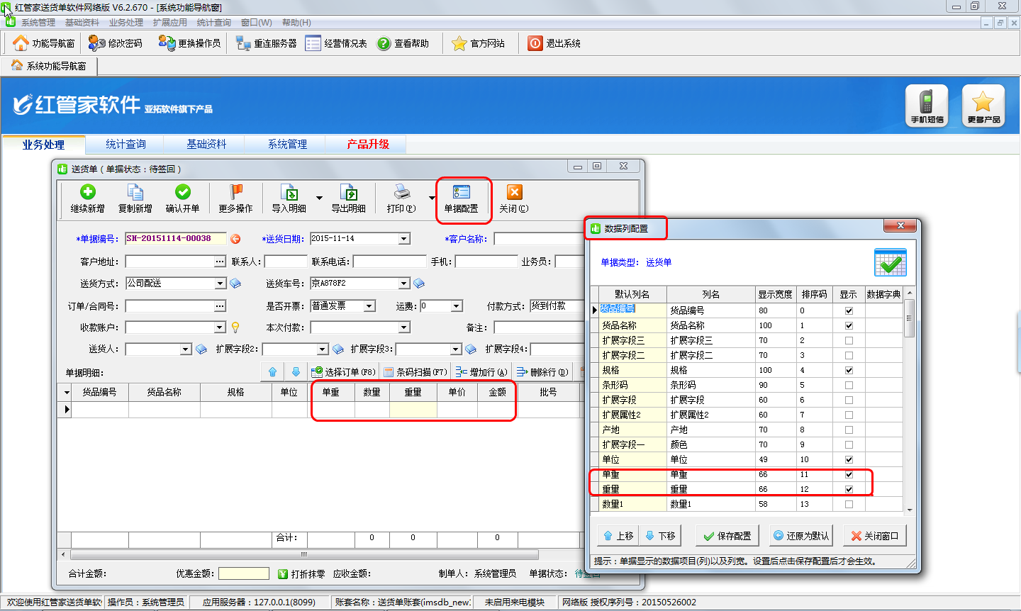 另外在開(kāi)單頁(yè)面點(diǎn)“單據(jù)配置”,會(huì)彈出數(shù)據(jù)列配置界面,在數(shù)據(jù)列配置頁(yè)面中將“單重”、“重量”打勾顯示出來(lái),下圖以新開(kāi)送貨單界面為例截圖說(shuō)明。