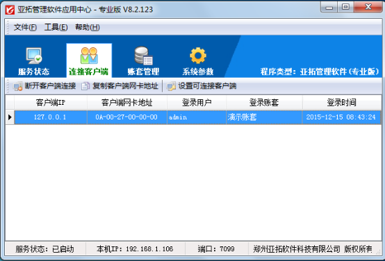 亞拓軟件采用新架構技術開發的進銷存管理軟件庫存管理軟件亞拓管理軟件星光版標準版專業版)、亞拓倉庫管理軟件(標準版、專業版)都支持主機(插有加密鎖的機器即為主機)在應用中心中對可連接的客戶端進行管理,可以管理已連接到主機(插有加密鎖的機器即為主機)的客戶端電腦信息,包括客戶端IP、客戶端網卡地址、登錄操作員、登錄賬套以及登錄時間,讓系統管理員很方便的對可連接應用中心的客戶端進行管理。下面我們以亞拓管理軟件專業版為例來詳細介紹下進銷存管理軟件中如何在應用中心對可連接客戶端進行管理。