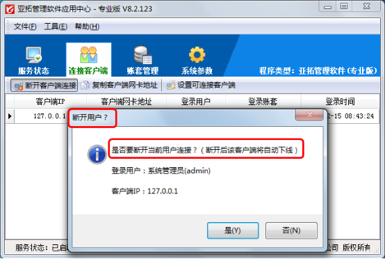 斷開客戶端連接:點“斷開客戶端連接”按鈕,可以斷開選擇的客戶端連接,對應的客戶端將自動下線,無法使用軟件。
