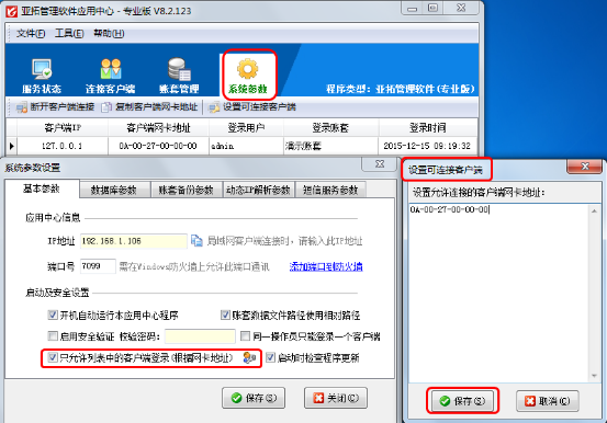 設置可連接客戶端:點擊“設置可連接客戶端”按鈕,可以設置允許哪些客戶端電腦登錄。使用這個功能的時候需要先在“系統參數設置”中復選“只允許列表中的客戶端登錄”。
