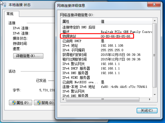 設置允許連接的客戶端網卡地址,每行一個網卡地址。客戶端的網卡地址可以在連接客戶端界面中點“復制客戶端網卡地址”,也可以在“網絡和共享中心”中“本地連接狀態”的詳細信息中查看到,如下圖所示。
