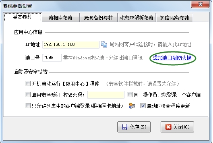 主機(jī)電腦的Windows防火墻或其他安全軟件的防火墻上需要開(kāi)放相應(yīng)的端口,軟件支持自動(dòng)添加防火墻規(guī)則。在應(yīng)用中心程序點(diǎn)“系統(tǒng)參數(shù)”可以設(shè)置自動(dòng)添加端口到防火墻。